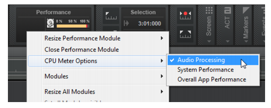 Performances globales de l'application. Indique sur un seul vumètre de processeur l'ensemble de l'utilisation du processeur par toute l'application SONAR et pour tous les cœurs.Cliquez avec le bouton droit de la souris sur le module Performances de la barre des commandes, passez la souris sur Options du vumètre de processeur, puis sélectionnez l'une des options suivantes :