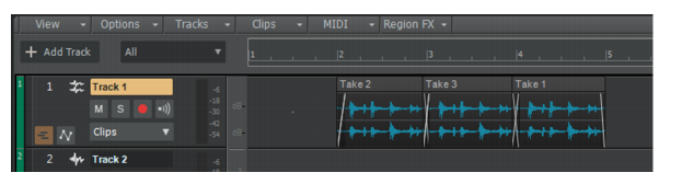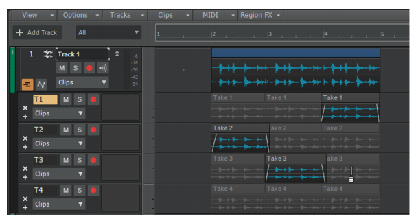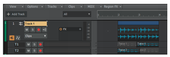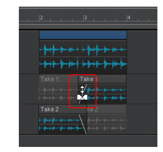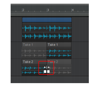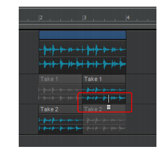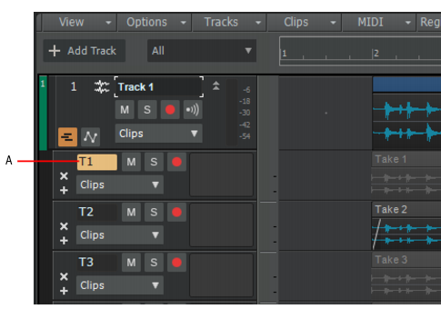 2. Sélectionnez la ligne de prise dans laquelle vous souhaitez coller les clips, puis cliquez sur Edition > Coller (ou appuyez sur CTRL+V). Les données sont alors collées à la position de lecture.A. Ligne active