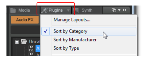 SONAR propose plusieurs dispositions de plug-ins qui vous permettent de trier l'explorateur de plug-ins de différentes manières. Pour sélectionner une disposition de plug-ins, cliquez sur le bouton du menu Plug-insdans l'explorateur, puis sélectionnez la disposition souhaitée :
