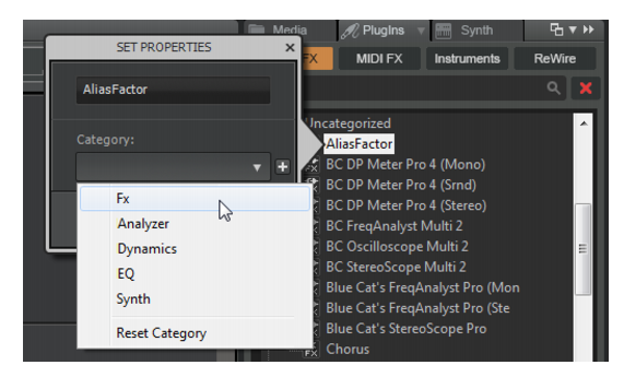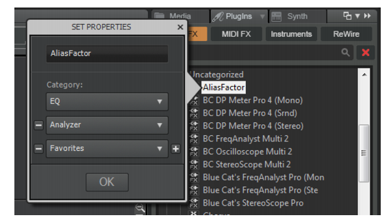 Trier par catégorie. Disposition par défaut, dans laquelle les plug-ins sont classés dans des sous-dossiers correspondant à chaque catégorie (égalisation, dynamique, reverb, etc.). Si un plug-in entre dans plusieurs catégories, il figure dans chaque sous-dossier.
