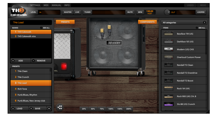 Figure 22. TH3 Cakewalk Edition.TH3 Cakewalk Edition par Overloud modélise à la perfection différents amplis de guitare, offrant aussi bien des sons clairs que des distorsions lourdes.Nouveautés par rapport à TH2 Cakewalk Edition :