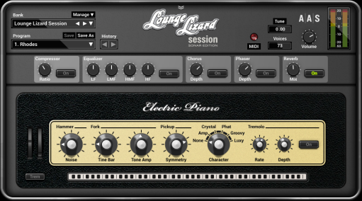 Figure 27. AAS Lounge Lizard Session.Lounge Lizard Session d'Applied Acoustics Systems est un piano électrique extrêmement polyvalent qui reproduit avec fidélité le son des Rhodes et des Wurlitzers.Pour plus d'informations, voir l'aide en ligne de Lounge Lizard Session.