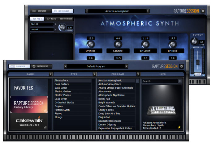 Figure 38. Rapture SessionRapture Session est un lecteur de sons Rapture Pro qui est également compatible avec les patchs et les packs d'extension Dimension, Dimension Pro, Dimension LE, Rapture, Rapture LE et Cakewalk Sound Center.Associant puissance, élégance et ergonomie à une fantastique banque de sons, Rapture est l'un des synthétiseurs les plus impressionnants du marché. Aussi efficace pour les basses que pour les leads ou les nappes, et capable de générer des sons riches, hypnotiques et rythmiques, Rapture est idéal pour les nouveaux sons synthétiques qui colorent les compositions pop, dance et électro d'aujourd'hui.Pour plus d'informations, voir l'aide en ligne de Rapture Session.