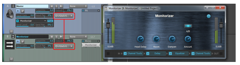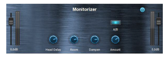 Remarque: Paradoxalement, l'image stéréo peut sembler élargie lorsque Monitorizer est activé, en particulier si les valeurs Room et Head Delay sont élevées. Cependant, il s'agit en général d'une image stéréo plus satisfaisante, car elle ne donne pas un rendu aussi exagéré.