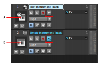 Les pistes d'instruments divisées. Ces pistes permettent de créer des pistes audio distinctes pour chacune des sorties du synthé virtuel, ainsi qu'une piste source MIDI. Vous pouvez enregistrer les sorties audio du synthé directement sur les pistes audio séparées.Vous pouvez définir le type de la piste d'instrument dans la boîte de dialogue Options d'insertion du synthé virtuel quand vous insérez un nouveau synthé. Pour plus d'informations, voir Insertion de synthétiseurs virtuels et Boîte de dialogue Options d'insertion du synthé virtuel.Les pistes d'instruments simples et divisées se reconnaissent à leurs icônes de piste par défaut. De plus, les pistes d'instruments divisées contiennent un bouton Aperçu de la forme d'onde, et les pistes d'instruments simples un bouton Écho d'entrée