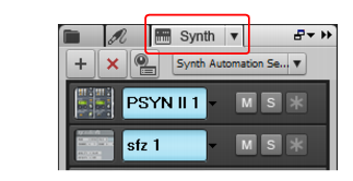 Remarque: Si vous ne voyez pas la commande Entrée, cliquez sur le bouton Commande de piste en haut du panneau Pistes et choisissez Tout. Pour plus d'informations, voir Configuration des commandes de la vue Pistes. Veillez également à agrandir entièrement la piste en faisant glisser sa bordure inférieure vers le bas.Pour être certain de ne pas muter également les pistes audio associées, veillez à ce que l'option Activer le Mute intelligent soit désactivée dans le menu Paramètres du synthé du rack de synthés (voir Mute intelligent sur les pistes d'instruments simples et Mute et écoute en solo des pistes d'un synthétiseur virtuel).Si vous souhaitez activer le Mute intelligent pour les pistes d'instruments divisées, ouvrez l'explorateur du rack de synthés, cliquez sur le menu Paramètres du synthé et sélectionnez Activer le Mute intelligent dans le menu déroulant.Figure 47. Explorateur de rack de synthés.