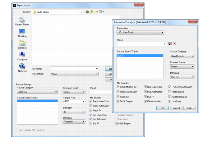 Les paramètres de la boîte de dialogue Exporter audio et de la boîte de dialogue Convertir sur pistes s'enregistrent maintenant dans les projets et les modèles de projets. Vous n'avez donc plus à reconfigurer chaque fois les paramètres de conversion et d'exportation.
