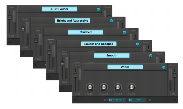 Wider. Cette chaîne FX Chain offre une commande Width et deux paramètres Tighten, pour un processus de mastering plus simple. Utilisez la commande Tighten 1 pour un résultat subtil, et la commande Tighten 2 pour un résultat plus radical.