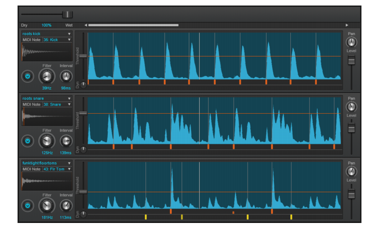 Drum Replacer intègre une bibliothèque de sons de remplacement. Vous pouvez aussi importer vos propres sons (.wav, .aif, .aiff, .ogg et fichiers multi-échantillons .sfz). Pour plus d'informations, voir Charger un échantillon de remplacement.Le remplacement des sons de batterie fonctionne de façon optimale lorsque chaque élément du kit est isolé sur une piste audio distincte (grosse caisse sur une piste, caisse claire sur une autre piste, et ainsi de suite). Toutefois, grâce aux filtres sophistiqués de Drum Replacer, il est également possible de remplacer les sons de batterie d'une piste de batterie stéréo déjà mixée. Pour plus d'informations, voir Isoler un son de batterie.Figure 60. Drum Replacer.