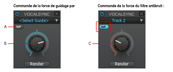 Figure 64. Éditeur VocalSync.A. Afficher ou masquer la commande de force du filtre antibruit B. Force de guidage (voyant bleu) C. Force du filtre antibruit (voyant rouge)