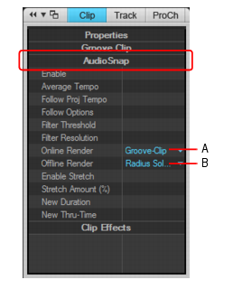 VocalSync utilise une formule, ou un algorithme, pour l'étirement des données audio. L'algorithme de pré-écoute en direct est peu gourmand en ressources, tandis que l'algorithme de rendu en différé sollicite davantage le processeur. Pour plus d'informations, voir Générer le rendu d'un clip Region FX et Éditeur de VocalSync.Par défaut, les clips VocalSync héritent des modes de rendu en temps réel et en différé définis par défaut dans Aud.ini. Vous pouvez outrepasser les modes de rendu par défaut pour les clips VocalSync sélectionnés directement dans l'inspecteur de propriétés de clip. Cette approche facilite l'optimisation de la qualité du rendu en fonction des différents types de voix à traiter.A. Mode de rendu en temps réel B. Mode de rendu en différéLa section AudioSnap indique le mode de rendu en ligne et le mode de rendu en différé du clip sélectionné. Si vous sélectionnez plusieurs clips associés à des modes de rendu différents, les listes Rendu en temps réel et Rendu en différé indiquent (Multi).