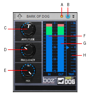 Figure 79. Boz Digital Labs Bark of Dog.A. Témoin d'écrêtage B. Activer/Désactiver le module Bark of Dog C. Amplitude D. Fréquence E. Mixage F. Vumètre d'entrée G. Vumètre de sortie H. Gain