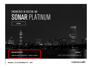Vous pouvez désormais connaître l'état de votre abonnement SONAR dans la boîte de dialogue À propos. Pour ouvrir cette dernière, cliquez sur Aide > À propos de SONAR. L'état de votre abonnement et sa date de fin sont indiquées dans l'angle inférieur gauche.Figure 84. Boîte de dialogue À propos.