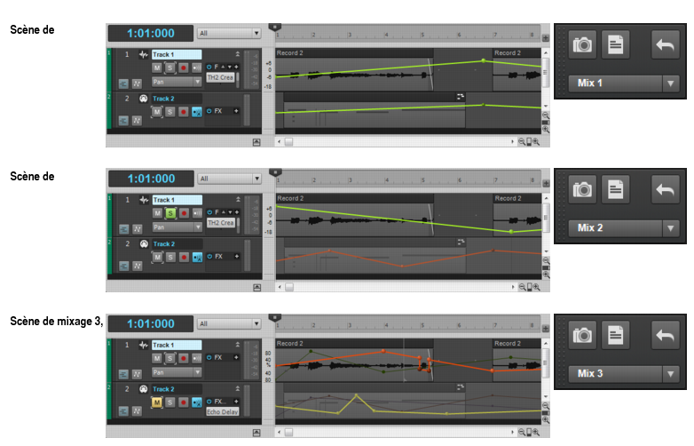 Liste des scènes de mixage. Liste des scènes de mixage enregistrées. Sélectionnez une scène de mixage pour charger le mixage correspondant. Si le projet contient plus de dix scènes de mixage, la liste est affichée dans un sous-menu Rappeler la scène.