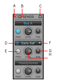 A. Défiler vers le haut B. Défiler vers le bas C. Insérer un départ D. Activer le départ E. Commutateur pré/post du départ F. Destination du départ G. Panoramique du départ H. Niveau du départCliquez sur le menu Options de la vue Console, survolez Départs et sélectionnez l'une des options suivantes :Cliquez sur la commande Affichage qui se trouve au bas de l'inspecteur de pistes, survolez Options du module > Départs auxiliaires et sélectionnez l'une des options suivantes :